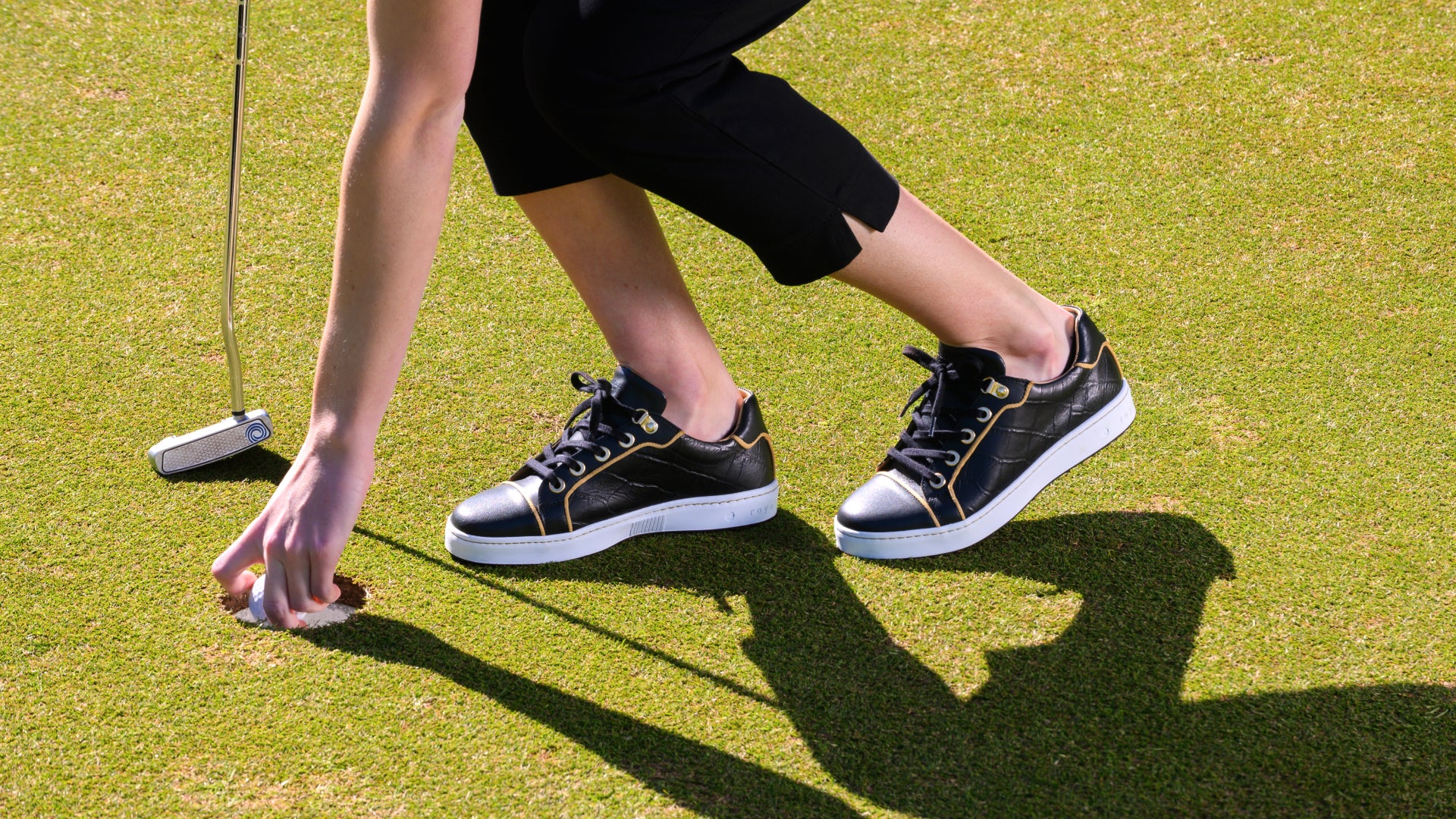 Sometimes it feels like we’re putting on a marble dance floor. Luckily, our Buckingham fits in perfectly with its croc print and gold ribbon piping so we can slow down and make that six-footer for birdie.