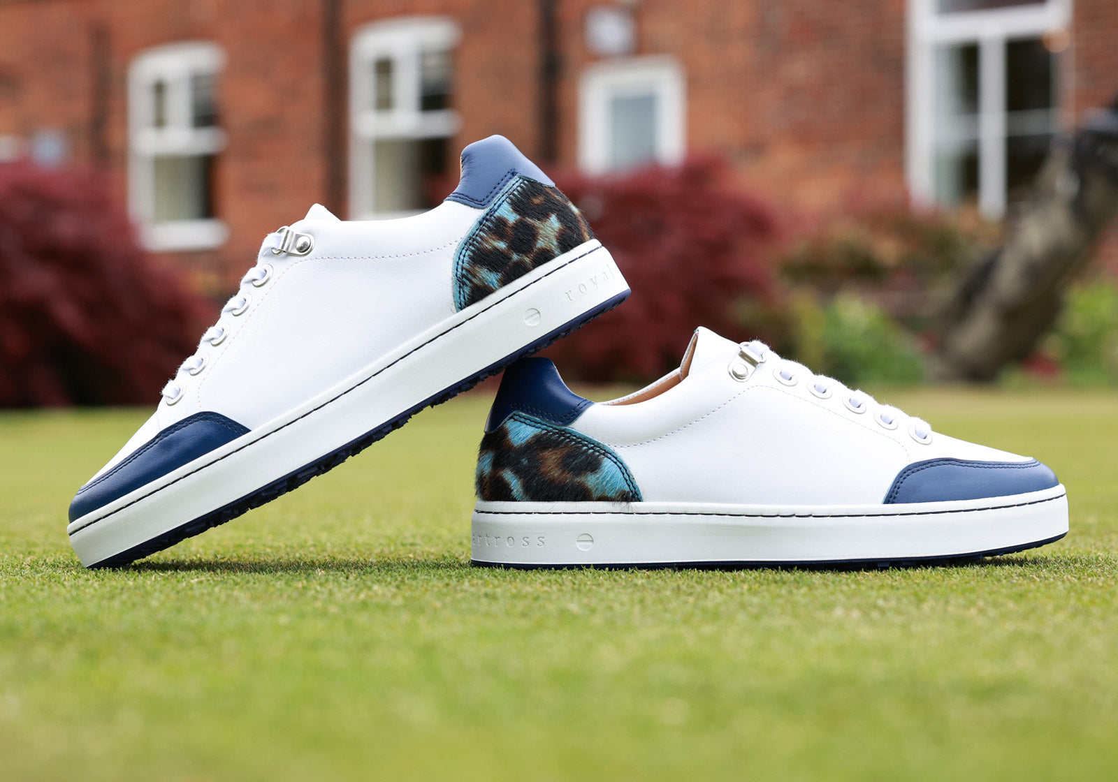 Women's White & Blue Leopard Fur Spikeless Golf Shoes.