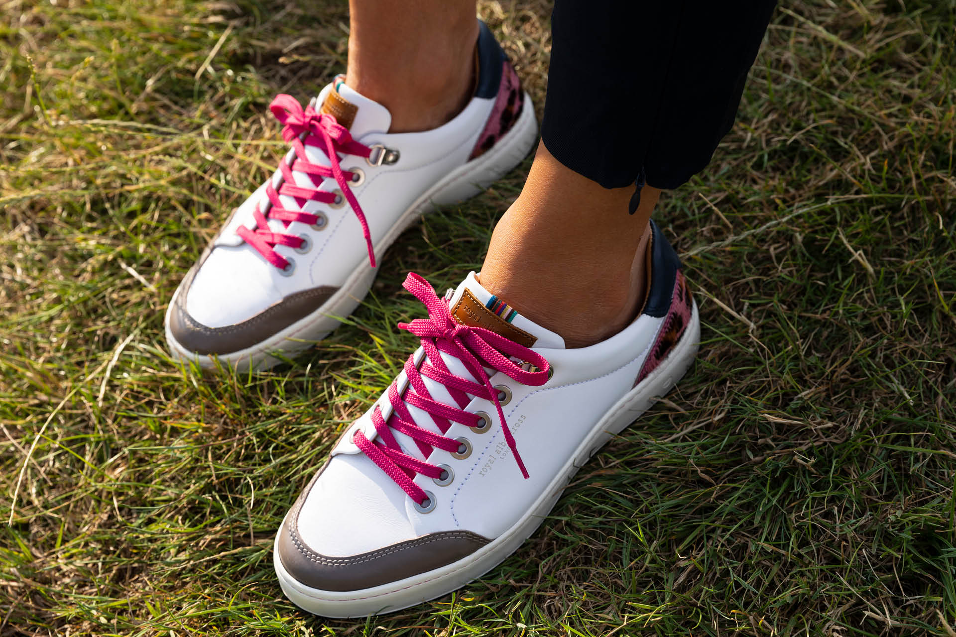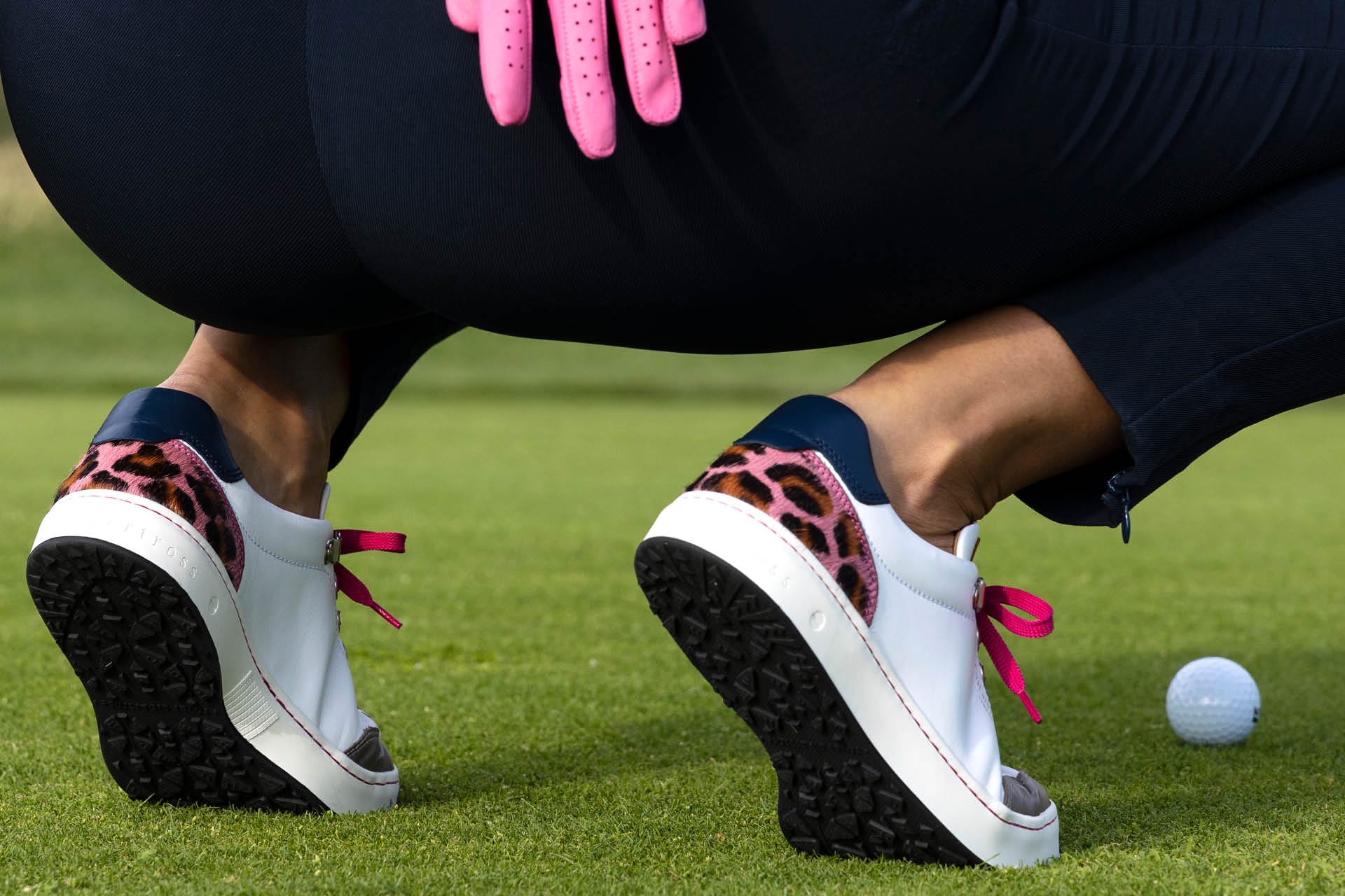 Women's White & Pink Leopard Fur Spikeless Golf Shoes.