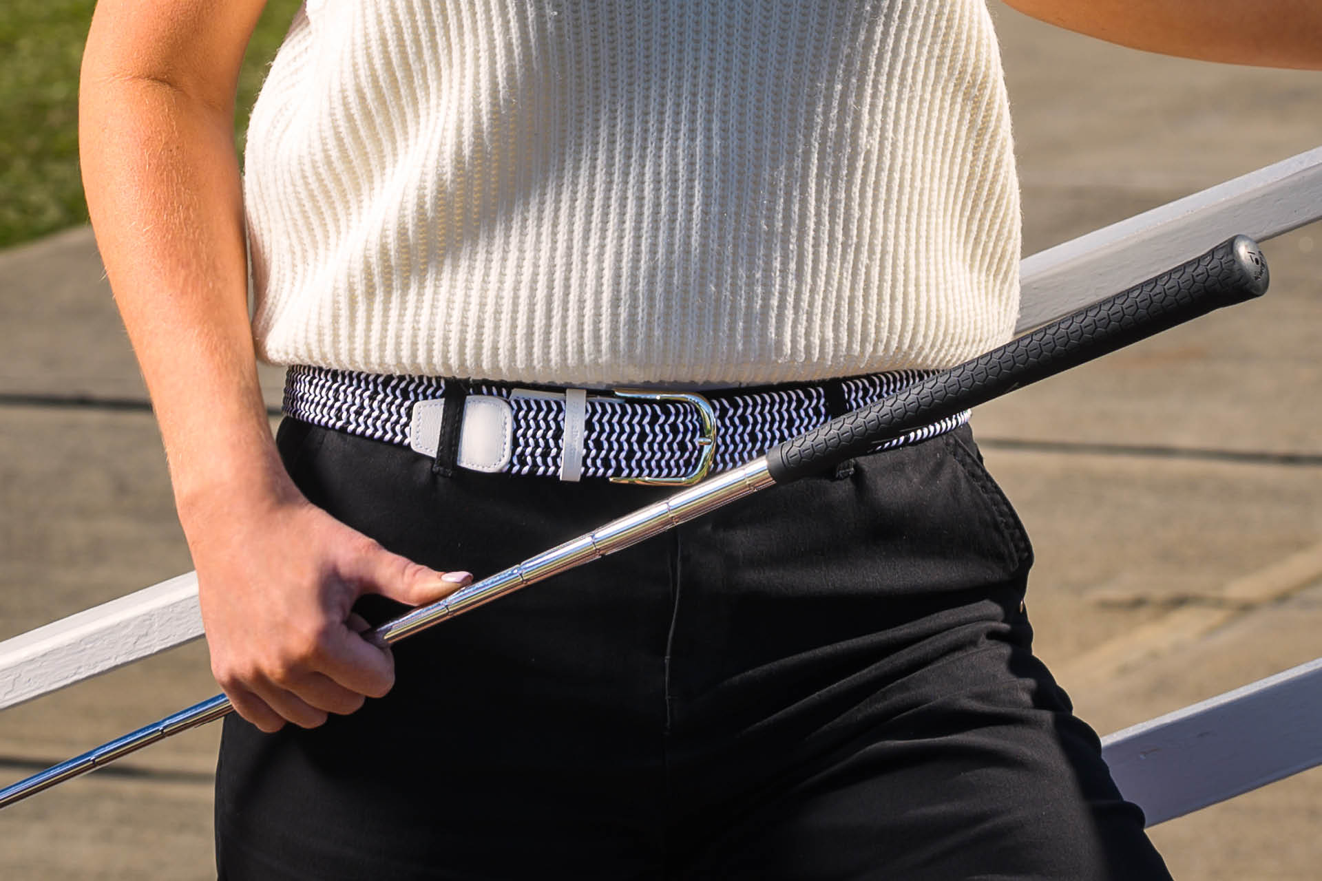 Tap into your athleticism and self-expression with Isabella. This Italian braided, elastic woven golf belt features European leather trim and a solid brass buckle, hand finished and coated for durability.